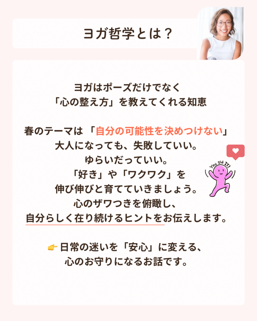 今回のクラスでは、難しいポーズを完成させることが目的ではありません。