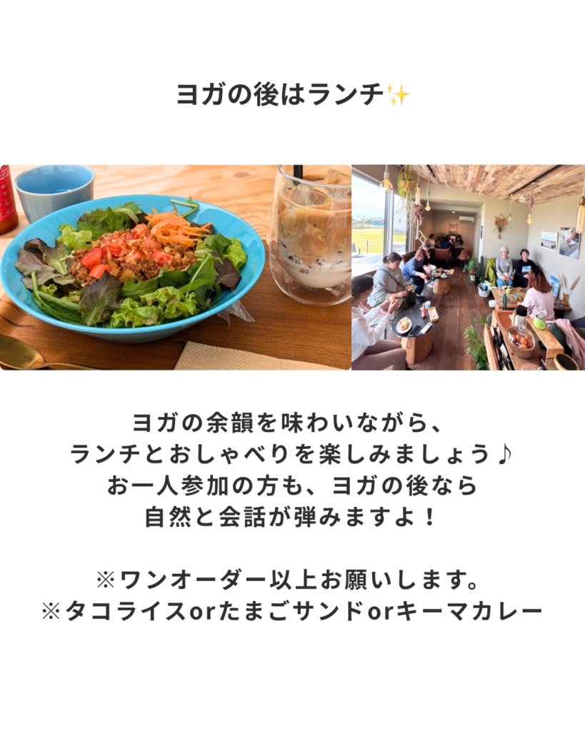 お一人での参加も大歓迎です!毎回お一人参加の方が大半です!ヨガの後のランチタイムでは、自然と会話が弾むアットホームな雰囲気ですので、安心してお越しください。